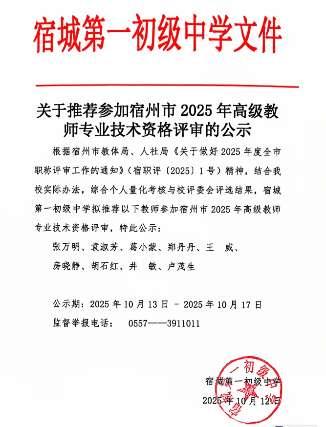 宿城第一初级中学推荐参加宿州市2025年高级教师专业技术资格评审的公示